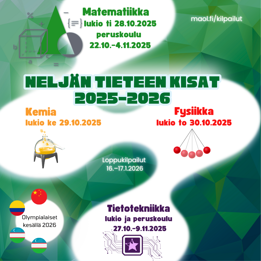 MAOL ry järjestää valtakunnallisen päässälaskukilpailun kaikille 7. luokkalaisille Mahtavaa matematiikkaa -päivänä 6.11.2025. Ensimmäinen kilpailu pidettiin 2021. Osallistuminen on kaikille Suomen…